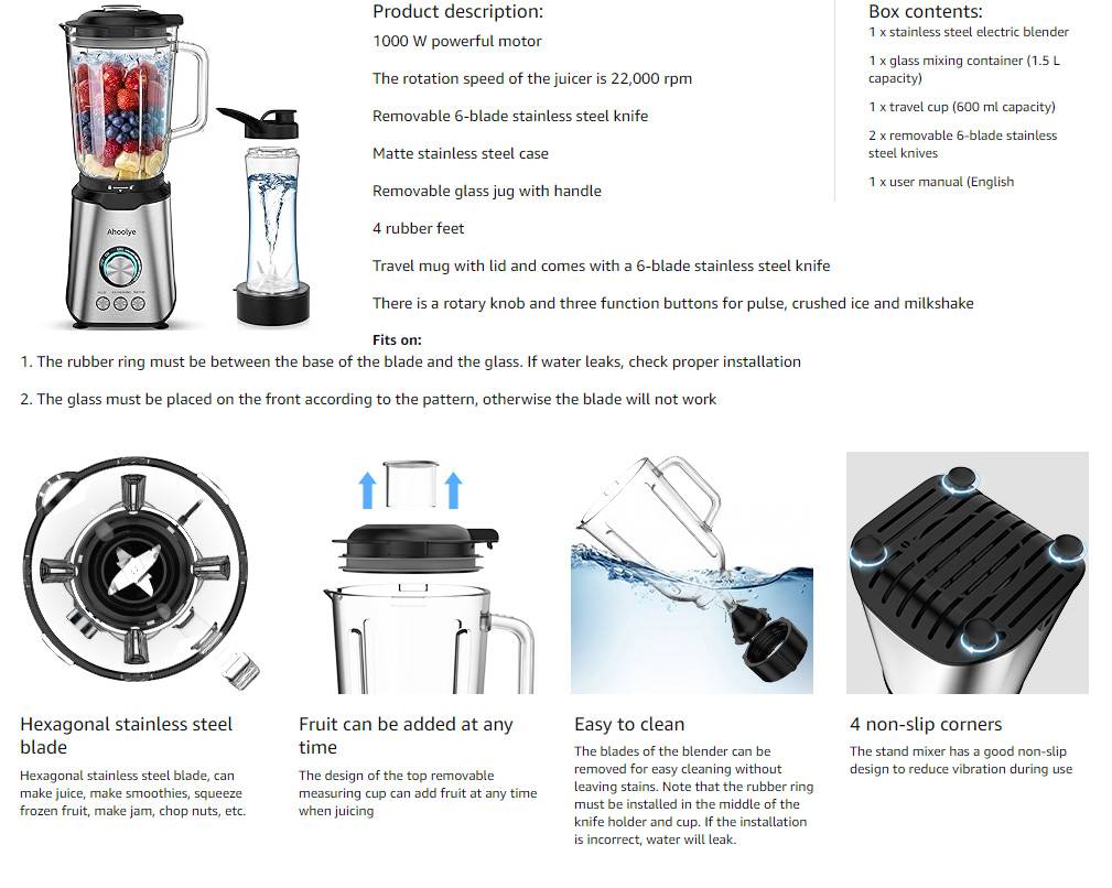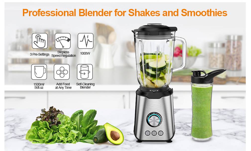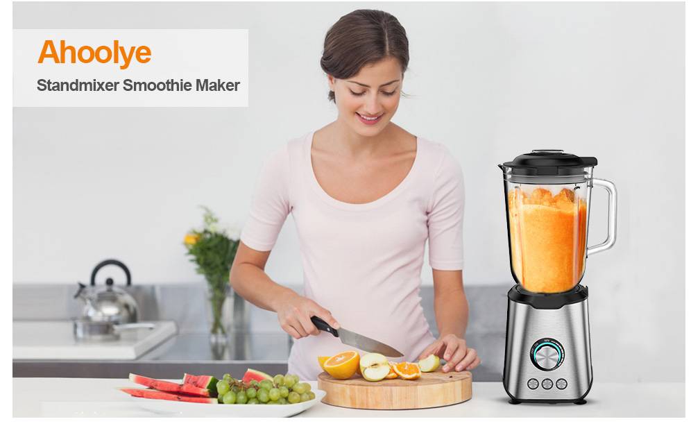 Ahoolye 1000W High-Power Blender - Stainless Steel, 1.75L Glass Container