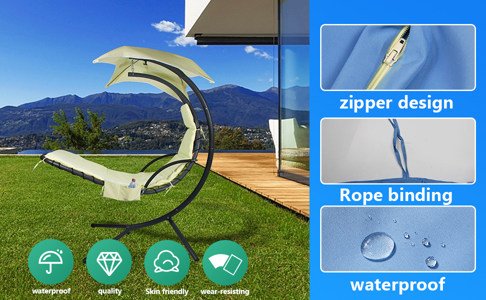 The fabric of the floating Chaise is tough and the built in Cushion and head rest are very comfortable when you lay on the canopy swing Chair.