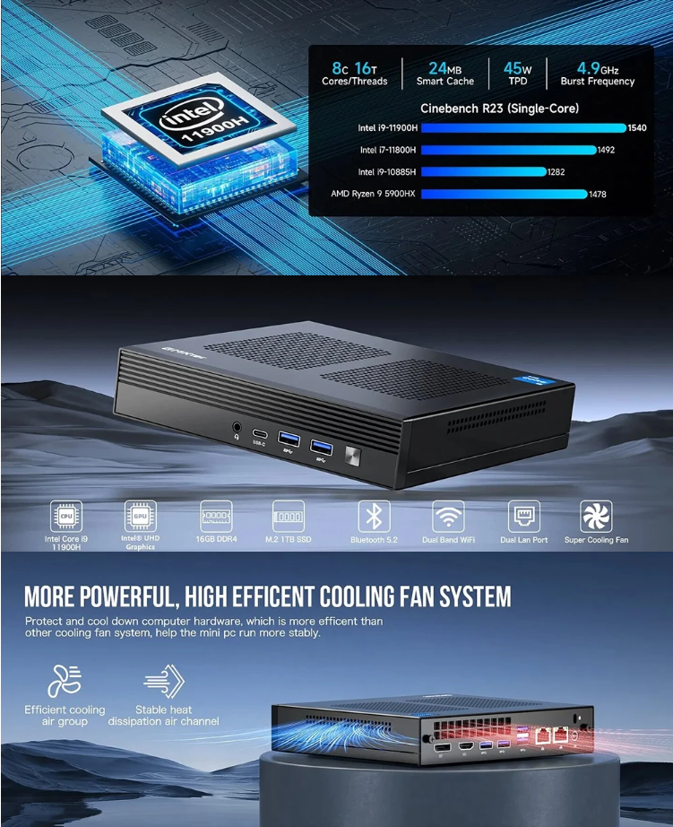 GMKtec M4 Intel Core i9-11900H Mini PC, 16GB DDR4 1TB SSD, Window 11 Pro, WiFi 6, BT5.2, USB3.2, Triple HD 4K