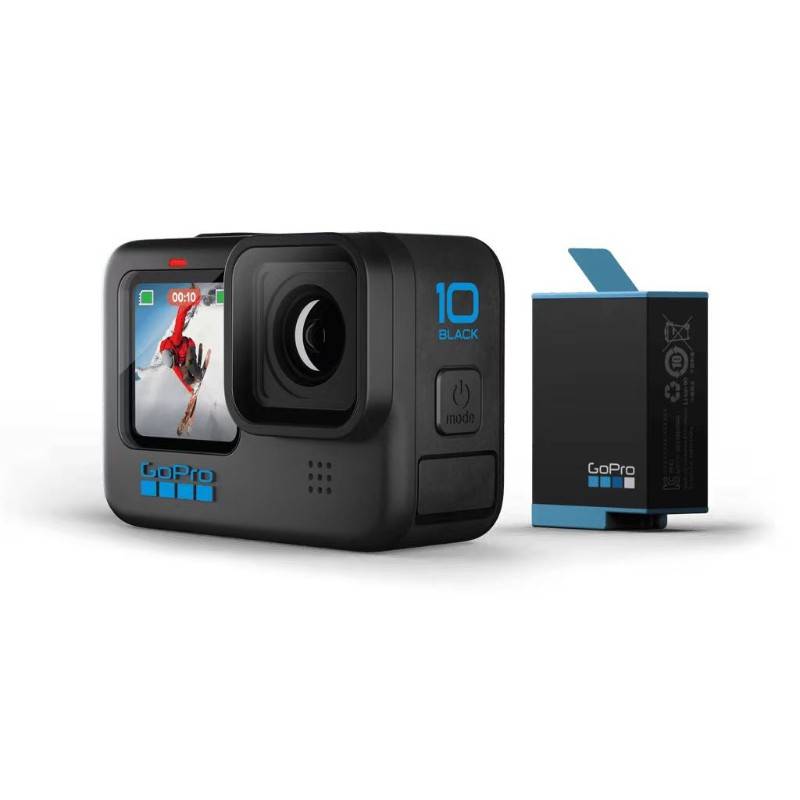 Includes HERO10 Black camera, carrying case, rechargeable battery, curved adhesive mounts, mounting buckle + thumb screw and USB-C cable