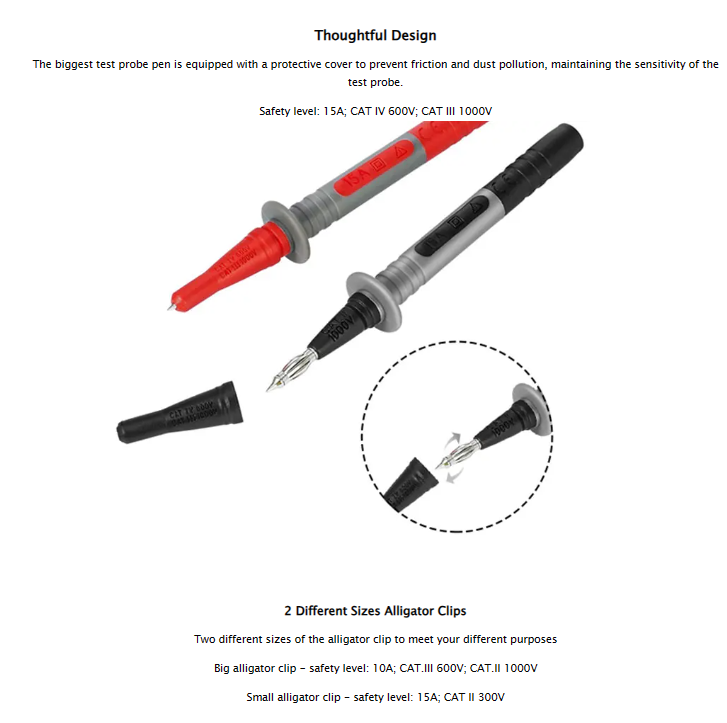 KAIWEETS KET05 Digital Multimeter Probe Soft Wire Needle Tip Universal Test Leads with Alligator Clip 1000V 10A