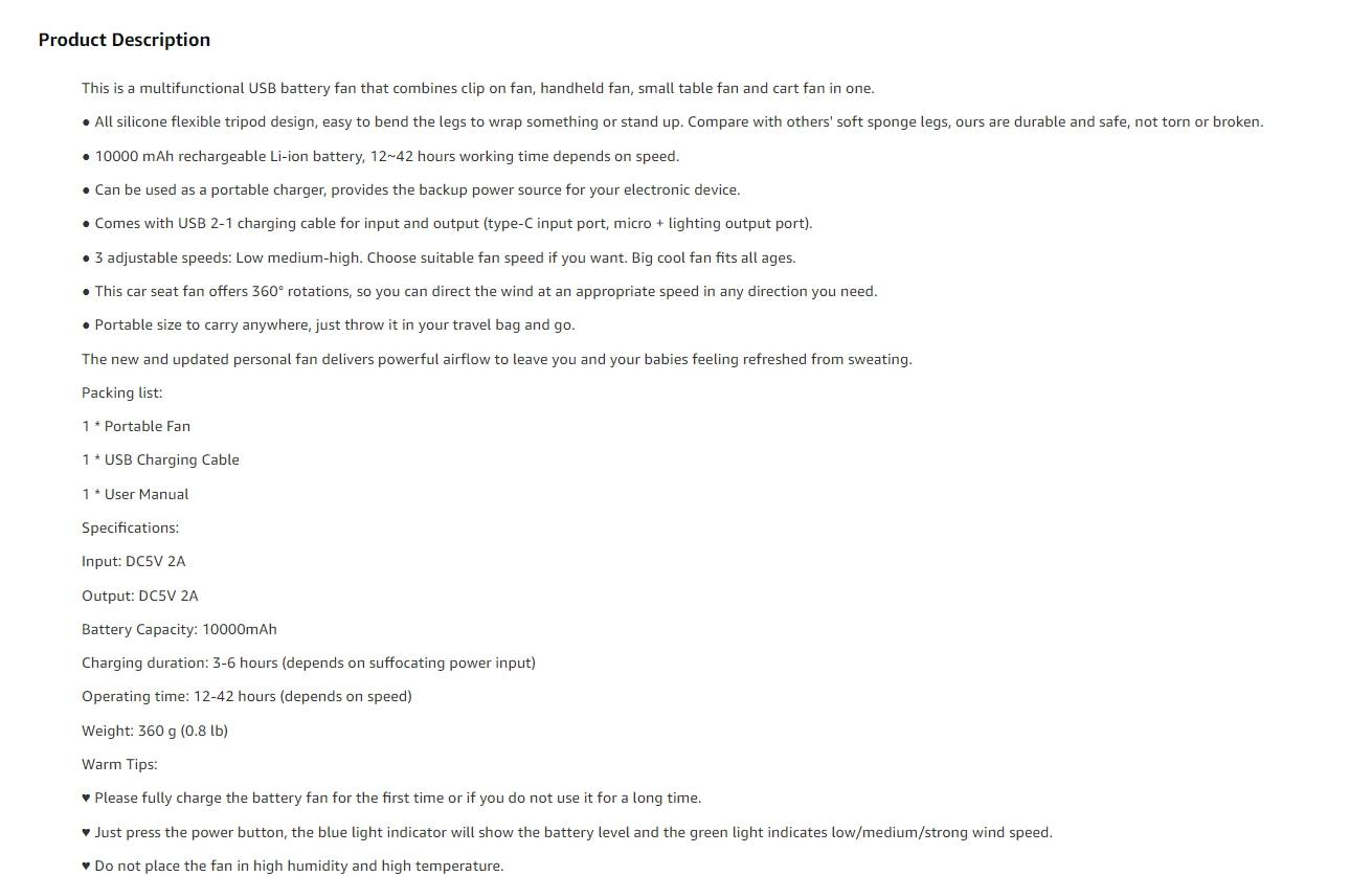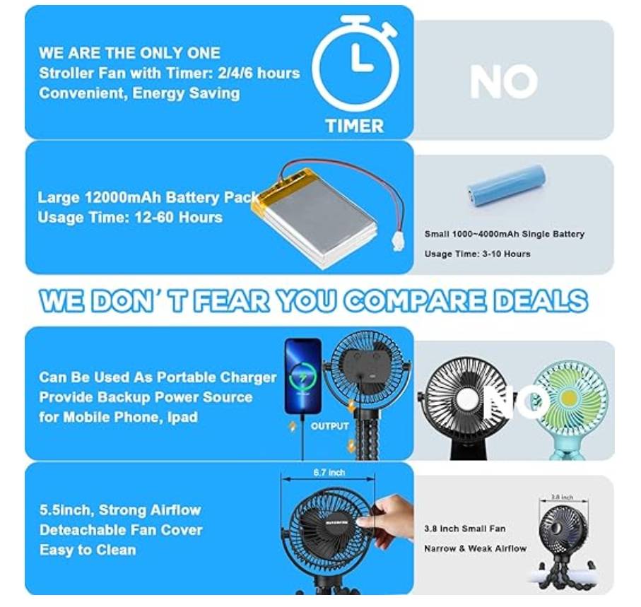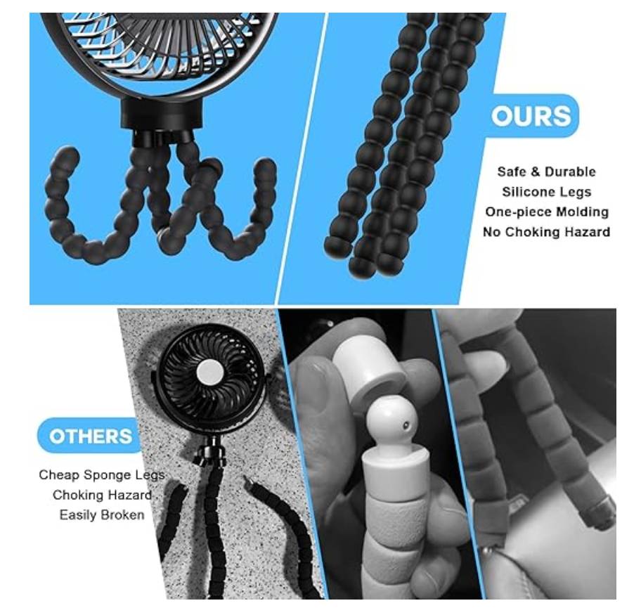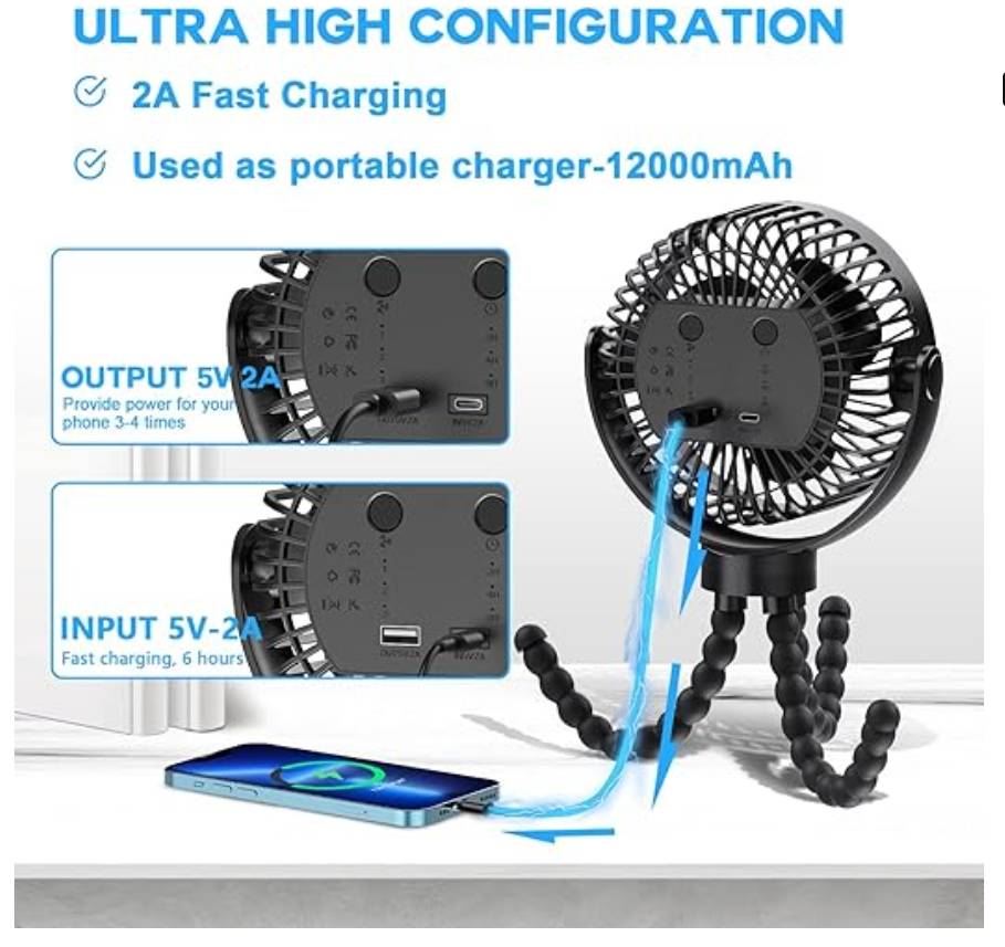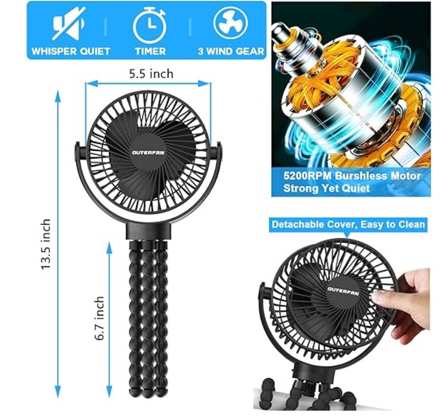 Portable Stroller Fan, 42H 10,000 mAh, Battery Operated Fan, Flexible Tripod, with Small Clip for Stroller, Car Seat, Golf Cart