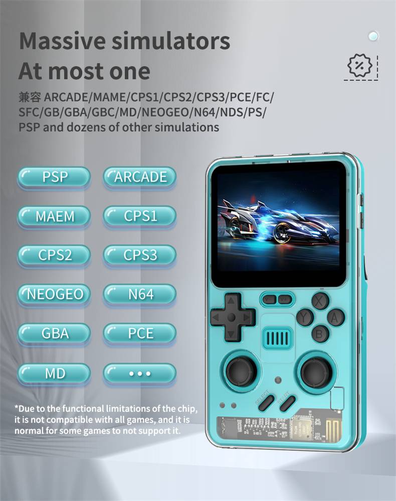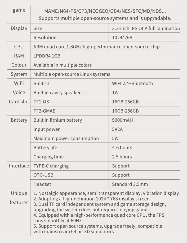 1. Nostalgic semi-transparent design with vibration feedback. 2. High-definition 1024*768 display screen for clear visuals. 3. Dual TF card design for independent system and game storage. 4. Equipped with a high-performance quad-core CPU, ensuring smooth 60Hz FPS gameplay. 5. Support for open-source systems, allowing free upgrades and compatibility with mainstream 64-bit 3D simulators.