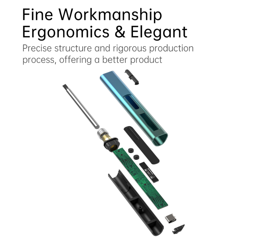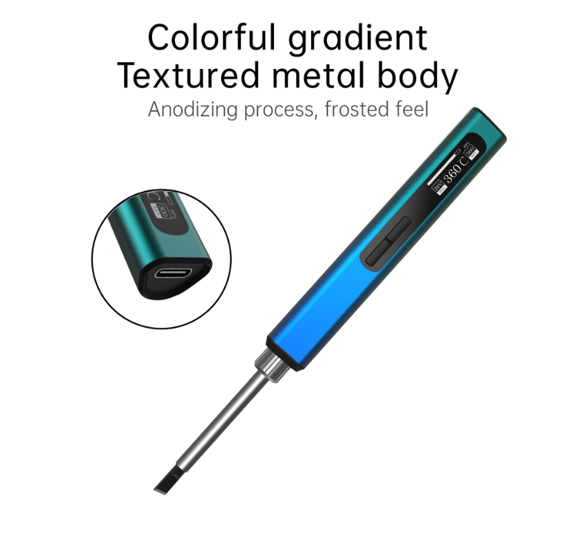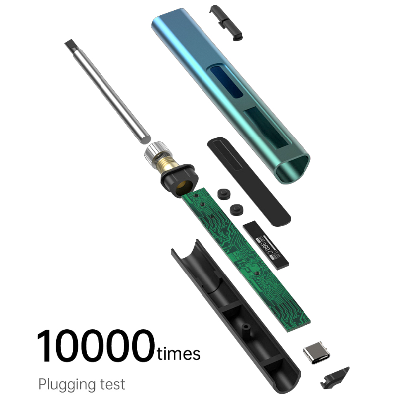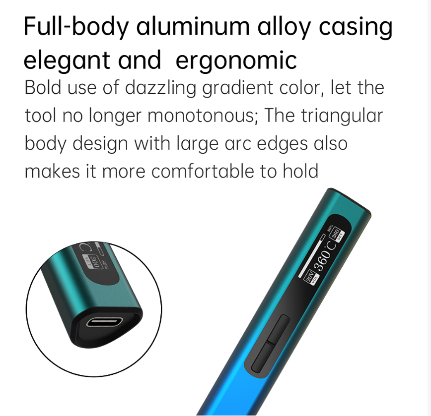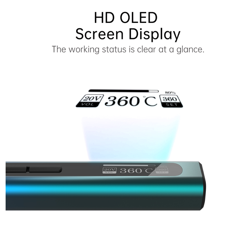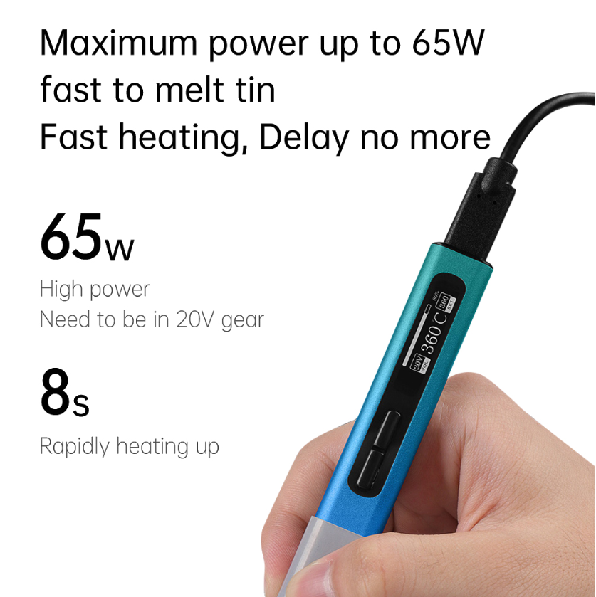 This intelligent soldering iron has a OLED display, and the internal heating part design and ceramic heating core, which can provide sufficient heating energy and improved thermal conductivity to ensure 8s quickly heating speed, can meet multiple usage scenarios. Compatible with Quickcharge 3.0 and PD 2.0 protocols, with small power and protocol dependence, and supporting direct current power supplying mode.