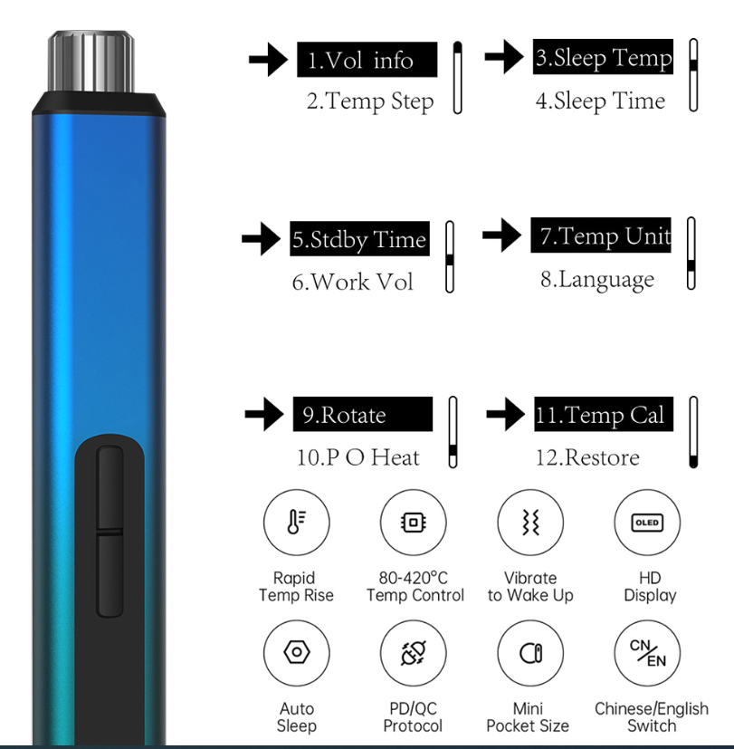 Multiple Parameters Setting: Support set the working voltage of 5-20V, set the standby time and standby temperature, temperature step-values, temperature units, automatic shutoff time.