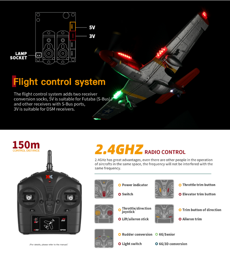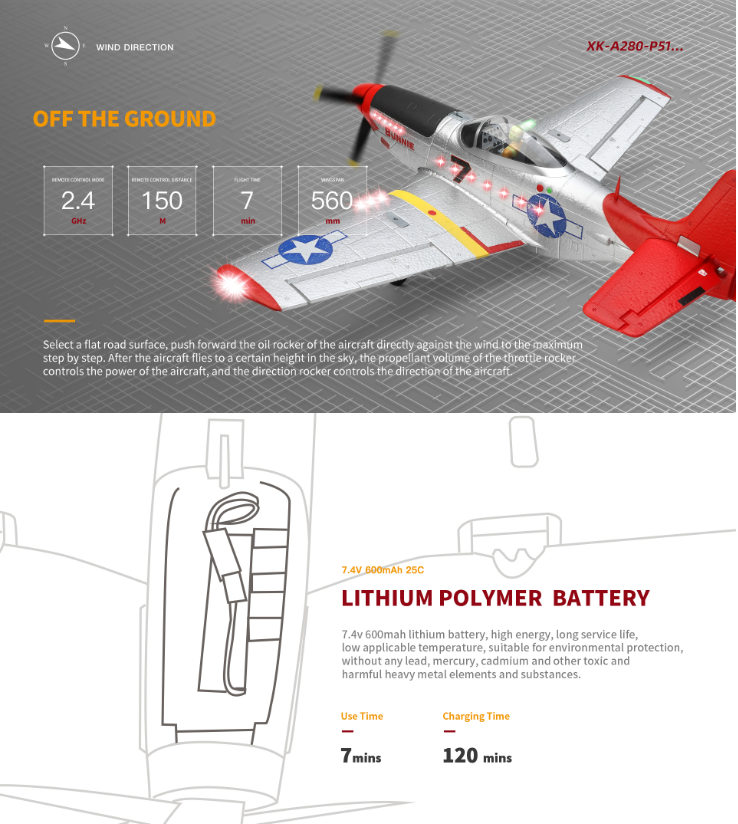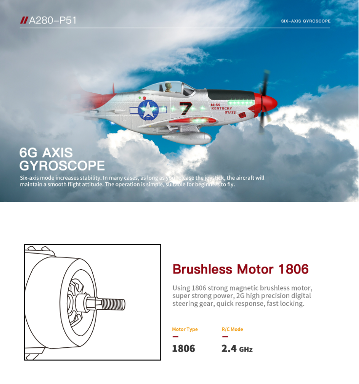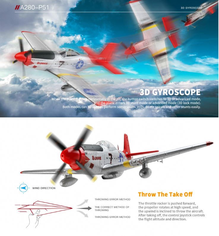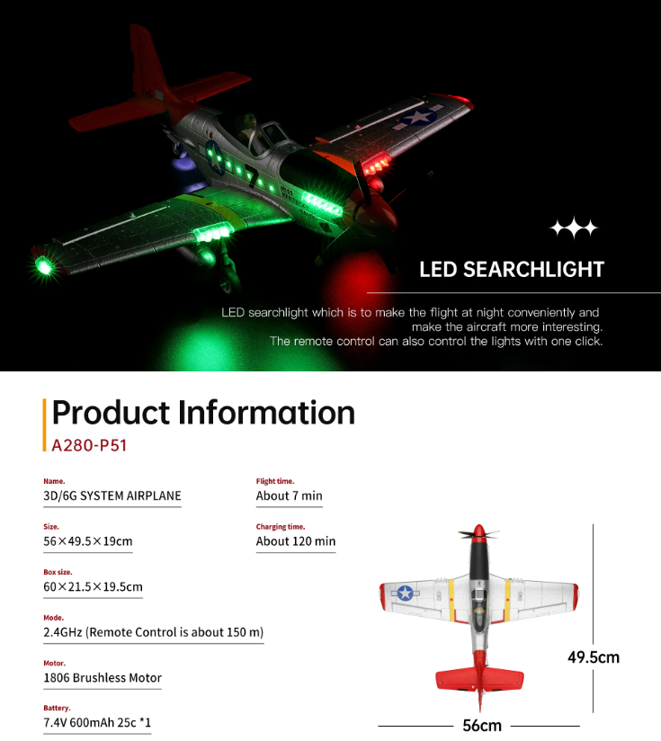 XK A280 P-51 Mustang 3D/6G System 560mm Wingspan 2.4GHz 4CH EPP RC Airplane Fighter RTF With LED Lights for Beginner